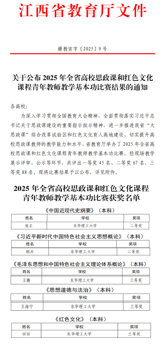 近日,由中共江西省委教育工委、江西省教育厅举办的2025年度全省高校思政课和红色文化课程青年教师教学基本功比赛结果公布,雷速网页版荣获二等奖2项、三等奖3项。其中,张正和胡卉分别荣获《中国近现代史纲要》和《习近平新时代中国特色社会主义思想概论》本科组二等奖,王腾、王海宁和田田荣获《毛泽东思想和中国特色社会主义理论体系概论》《思想道德与法治》《红色文化》本科组三等奖。