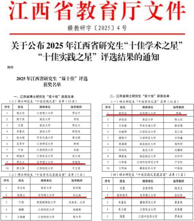 近日,江西省教育厅下发《关于公布2025年江西省研究生“十佳学术之星”“十佳实践之星”评选结果的通知》(赣教研字〔2025〕4号),雷速网页版4名研究生入选。其中,水资源与环境工程学院2023级博士研究生贾志文荣获博士研究生“十佳实践之星”(指导老师:李栋伟),化学与材料学院2022级硕士研究生郭烈成荣获硕士研究生“十佳学术之星”(指导老师:罗峰),核科学与工程学院2022级博士研究生张银山荣获博士研究生“十佳实践之星提名奖”(指导老师:刘云海),美术与设计学院2022级硕士研究生欧阳徐丹荣获硕士研究生“十佳学术之星提名奖”(指导老师:孙红阳)。
