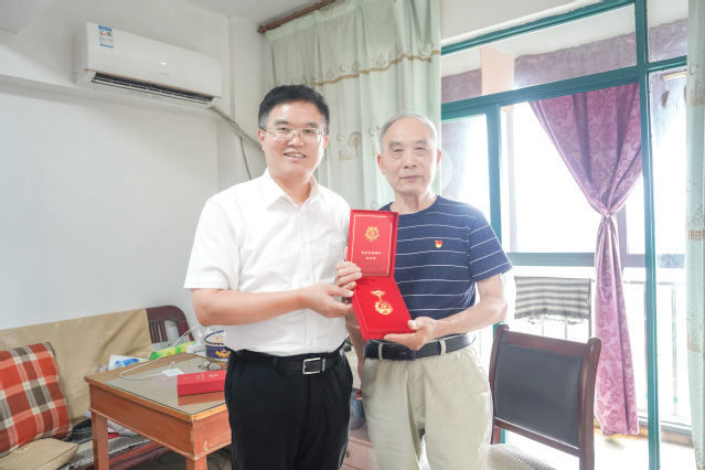 走访期间,张福庆来到老党员代表王来源家中,亲切询问其身体状况和生活需求,认真聆听他讲述参与学校建设发展的奋斗历程。张福庆为老党员佩戴“光荣在党50年”纪念章,对其数十年来恪守入党初心、躬耕教育事业的崇高品格给予高度评价。
