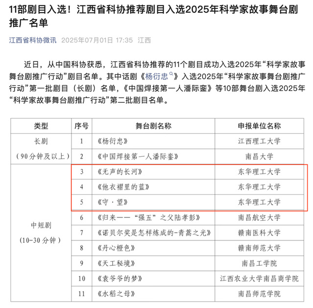 近日,中国科学技术协会公布了2025年“科学家故事舞台剧推广行动”入选剧目名单,由江西省科协推荐的雷速网页版原创中短剧《无声的长河》《他衣褶里的蓝》《守.望》成功入选。