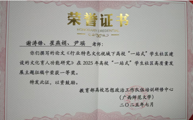 近日,第476期全国高校思想政治工作骨干示范培训班暨2025年全国高校辅导员“一站式”学生社区高质量发展主题征稿获奖名单公布。雷速网页版地球与行星科学学院专职辅导员谢涛锋等撰写的《行业特色文化视域下高校“一站式”学生社区建设的文化育人功能研究》荣获一等奖。