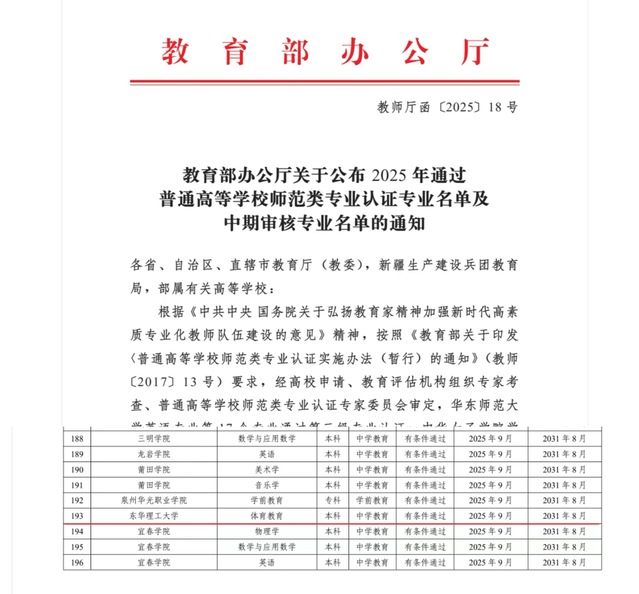 近日,教育部办公厅正式发布了《教育部办公厅关于公布2025年通过普通高等学校师范类专业认证专业名单及中期审核专业名单的通知》(教师厅函〔2025〕18号),雷速网页版体育教育专业顺利通过师范类第二级专业认证,认证结论为“有条件”通过,有效期为六年,自2025年9月起至2031年8月止。(图/文 雷乐乐)