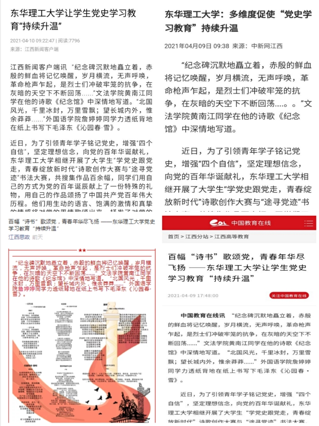 编者按:近日,党史学习教育在我校全面展开,在大学生“学党史跟党走,青春绽放新时代”诗歌创作大赛与“途寻党迹”书法大赛中,同学们用百幅“诗书”歌颂党,献礼百年华诞,谱写青春新篇。学校多维度促使学生党史学习教育“持续升温”,让党史学习教育“热”起来、“活”起来、“火”起来,通过“三学三进三讲”,将党史学习教育与讲好“红色故事”、校史院史教育、思政课程及课程思政教育、校园文化建设、劳动教育五个方面进行深度融合,引导广大学子“知史爱党、知史爱国、知史爱校”,引导青年学子努力成长为担当民族复兴大任的时代新人。中国教育在线、中国新闻网、江西新闻客户端、江西思政等媒体对此进行报道,现将相关内容转载如下: