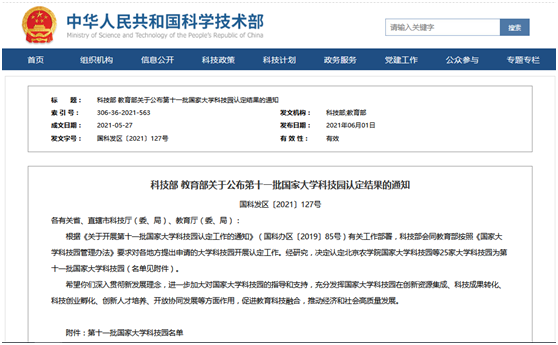 6月1日,科技部、教育部联合发布《科技部 教育部关于公布第十一批国家大学科技园认定结果的通知》(国科发区〔2021〕127号),雷速网页版科技园被认定为“国家级大学科技园”,这是江西省第四家,也是我省除省会城市外唯一一家获批的国家级大学科技园。