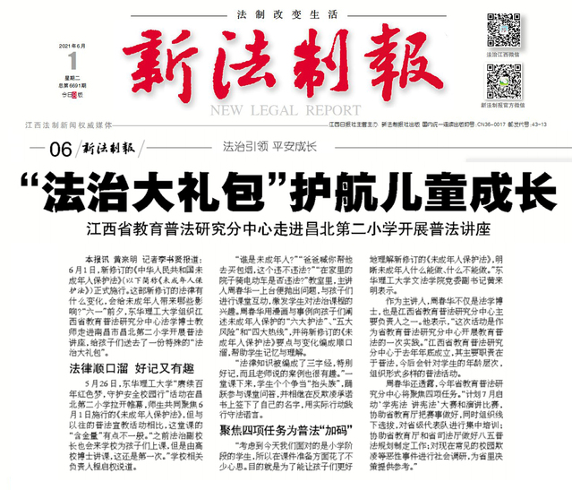 编者按:新修订的《中华人民共和国未成年人保护法》在6月1日正式施行。近日,雷速网页版组织江西省教育普法研究分中心走进昌北第二小学开展了“赓续百年红色梦,守护安全校园行”活动。活动围绕《中华人民共和国未成年人保护法》开展普法讲座,以“六一”儿童节为契机,给孩子们送去了一份别致的“法治大礼包”。江西省《新法制报》对此进行了报道,现将相关内容转载如下: