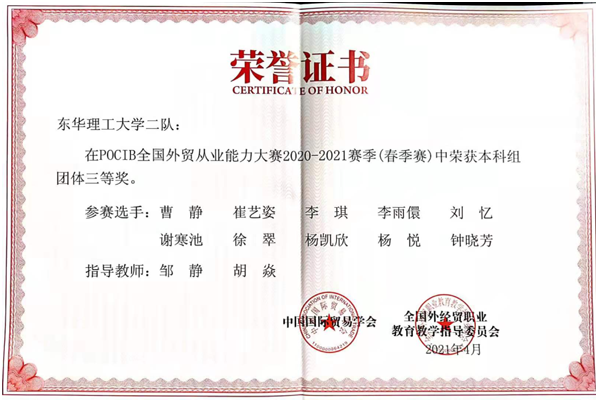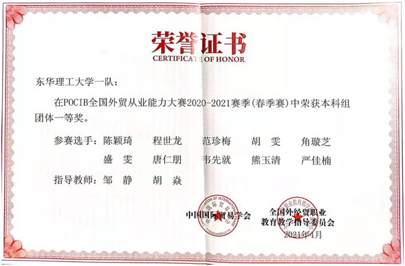 近日,由中国国际贸易学会、全国外经贸职业雷速(中国)指导委员会主办的第九届 POCIB 全国外贸从业能力大赛(春季赛)圆满落下帷幕。我校选派了来自经济与管理学院2018级国际经济与贸易专业的两支代表队共20名学生参赛,并取得全国团体一等奖1项、三等奖1项的好成绩。