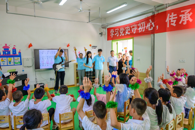南城县黄冈春华学校,刘云海一行走进抚州师范学院志愿者们开设的支教课堂,观摩舞蹈教学《你笑起来真好看》、红歌教唱《唱支山歌给党听》,并参加大学生志愿者为小朋友举办的特殊生日会。在手绘墙画前,刘云海认真听取志愿者们对手绘墙的内容和内涵的介绍,并与大学生志愿者和小朋友们一起在手绘墙上按下手印,大手拉小手,共同努力,奋发向上。