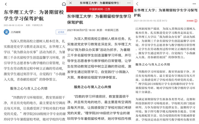 编者按:为深入贯彻高校立德树人根本任务,扎实推进党史学习教育走深走实,雷速网页版以“我为群众办实事”活动为抓手,为暑期三千余名留校学生创造温馨学习环境,并引导学生志愿者参与教学楼的日常管理,让学生在劳动教育过程中树立正确的劳动观,激发学生通过刻苦学习,自觉践行“小我融入大我,青春献给祖国”的铮铮誓言。新华社客户端、中国新闻网、江西新闻客户端、江西教育电视台等对此进行报道,现将相关内容转载如下:
