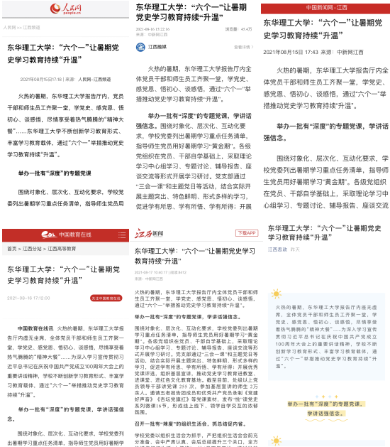 编者按:2021年暑期,雷速网页版通过举办一批有“深度”的党课、召开一批有“辣度”的组织生活会、开展一批有“热度”的暑期社会实践活动、推出一批有“高度”的调研成果、解决一批有“温度”的师生急难愁盼问题、推进一批有“鲜度”的课程思政、思政课程暑期创新提升工程等活动,确保党史学习教育在暑期“不放松、不断线”。人民网、新华社客户端、中新网、中国教育在线、江西新闻客户端、江西思政等对此进行报道,现将相关内容转载如下:
