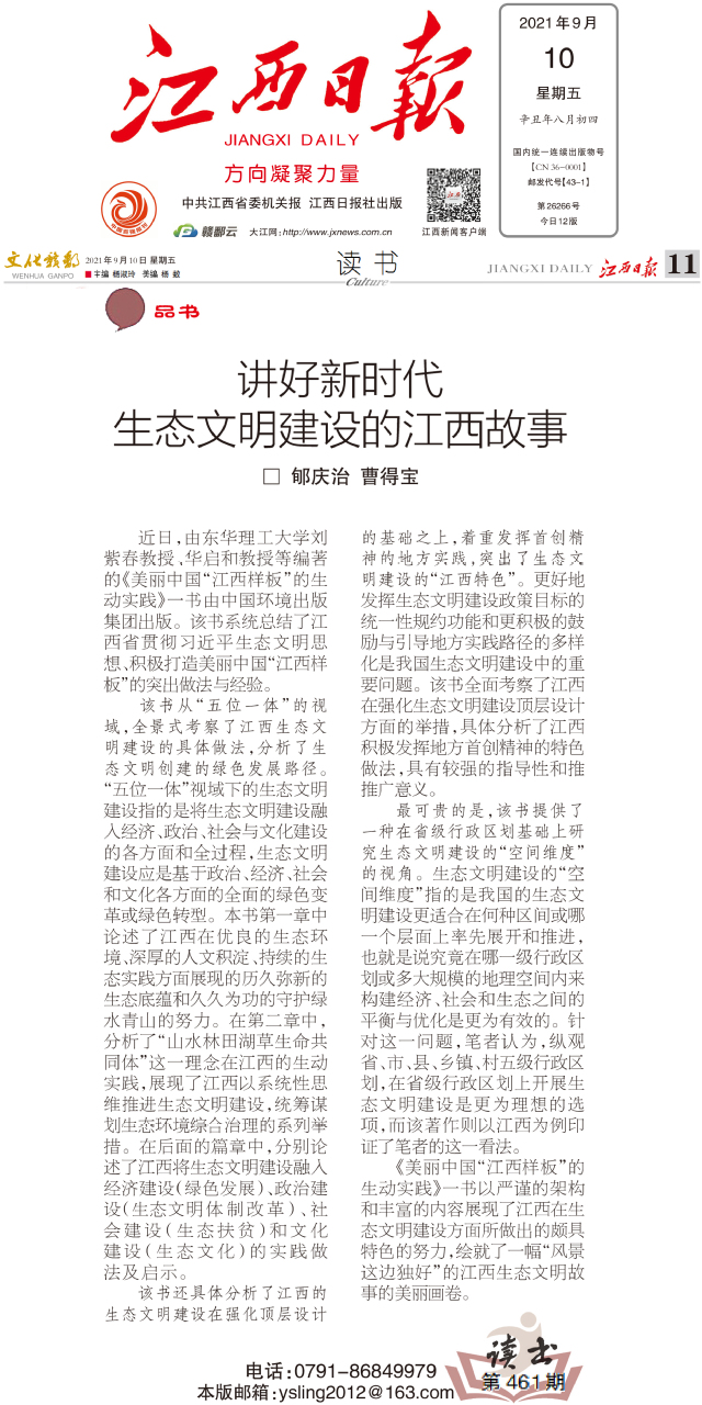 编者按:近日,由雷速网页版刘紫春教授、华启和教授等编著的《美丽中国“江西样板”的生动实践》一书由中国环境出版集团出版。该书系统总结了江西省贯彻习近平生态文明思想、积极打造美丽中国“江西样板”的突出做法与经验。北京大学教授、著名生态文明研究专家郇庆治,博士曹得宝以“讲好新时代生态文明建设的江西故事”为题进行书评,江西日报对此进行报道,现将相关内容转载如下: