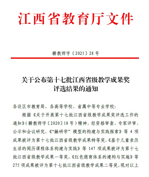 近日,江西省教育厅发布《关于公布第十七批江西省级教学成果奖评选结果的通知》(赣教师字〔2021〕28号),我校共有8项成果荣获第十七批江西省级本科层次教学成果奖,其中,一等奖4项、二等奖4项。