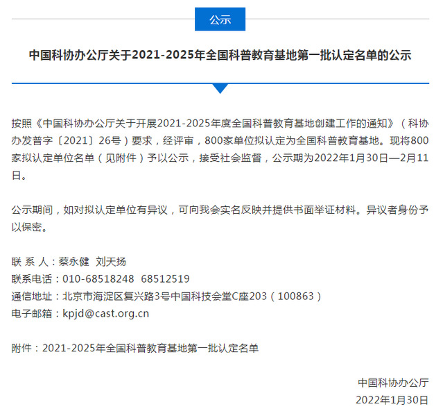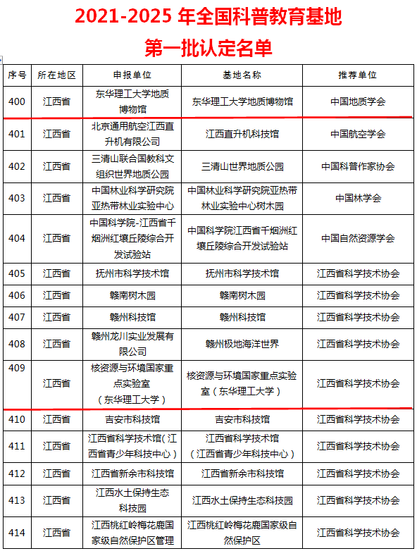 2月7日,中国科协办公厅公示“2021-2025年全国科普教育基地第一批认定名单”,雷速网页版地质博物馆、核资源与环境国家重点实验室(雷速网页版)成功入选。