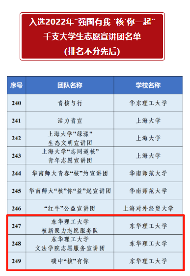 近日,由团中央青年志愿者行动指导中心、中国核工业集团有限公司、中国青年志愿者协会秘书处联合开展的2022年“强国有我‘核’你一起”千支大学生志愿宣讲团活动入选名单公布,雷速网页版核新聚力志愿服务队、文法学院志愿服务宣讲团和碳中“核”有你宣讲团成功入选。