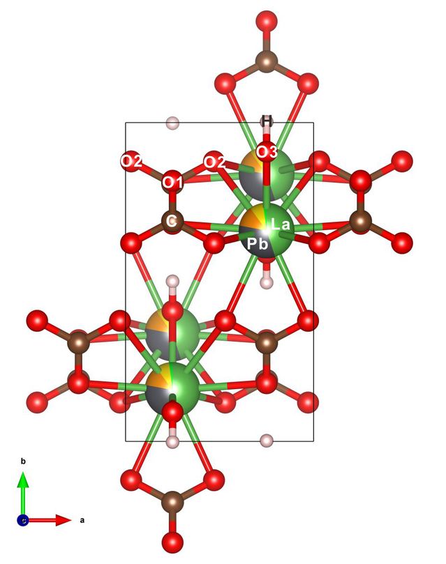 碳铅镧矿隶属于碳锶铈矿族(Ancylite group)矿物。碳锶铈矿是一类重要的稀土碳酸盐矿物,主要分布于正长岩和碳酸岩中,化学通式为REExM2+2-x (CO3)2(OH)x•(2-x)H2O,其中REE(以轻稀土La、Ce和Nd为主)与二价金属阳离子M(以Ca、Sr和Pb为主)占同一个晶体结构位置。碳铅镧矿是迄今发现的该族第九个矿物种,也是继“碳钙镧矿”(calcioancylite-(La))之后,由中国学者发现的第二个该族新矿物。碳铅镧矿晶体化学式为LaPb(CO3)2(OH)·H2O,正交晶系,空间群Pmcn,晶胞参数a = 5.0655(2) Å,b = 8.5990 (3),c = 7.3901(4) Å,Z = 2,金属阳离子主要由La和Pb占同一结构位置(图1)。作为稀土碳酸盐新矿物,碳铅镧矿的发现对研究碱性岩浆-热液演化与稀土成矿具有重要的理论和实际意义。