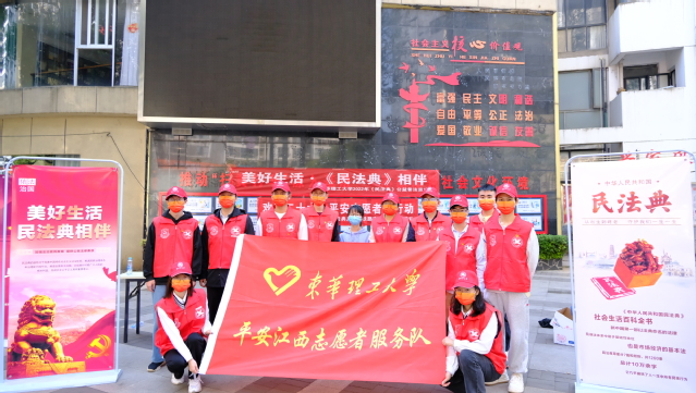 在活动现场,平安江西志愿服务队成员为市民发放《民法典》普法宣传册、宣传布袋、普法手持扇,用身边人、身边事向市民宣传《民法典》法律知识。广大市民积极参与,纷纷驻足并投入到志愿者生动有趣的普法宣传之中。带队老师在法律咨询点为市民现场解答民间借贷、交通事故、相邻关系、疫情防控等法律实务问题,并针对性地给出切实可行的解决建议。志愿服务队还组成两支小分队深入临街商铺、居民社区发放普法宣传册,宣传《民法典》知识,活动效果得到市民群众的一致好评。