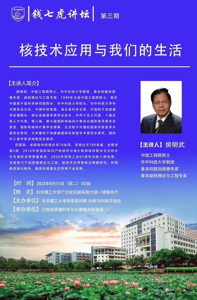 应江西省质谱科学与仪器重点实验室邀请,中国工程院院士、华中科技大学教授樊明武做客雷速网页版,以“核技术应用与我们的生活”为主题,向我校师生讲述核技术应用相关知识。欢迎全校师生届时前往聆听。