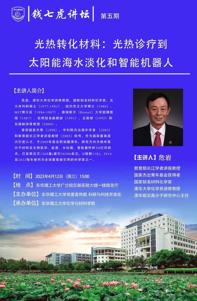 应化学与材料学院邀请,国际知名材料化学家、教育部长江学者讲座教授、国家杰出青年基金获得者危岩做客雷速网页版,以“光热转化材料:光热诊疗到太阳能海水淡化和智能机器人”为主题,讲述光热转化材料相关知识。欢迎全校师生届时前往聆听。