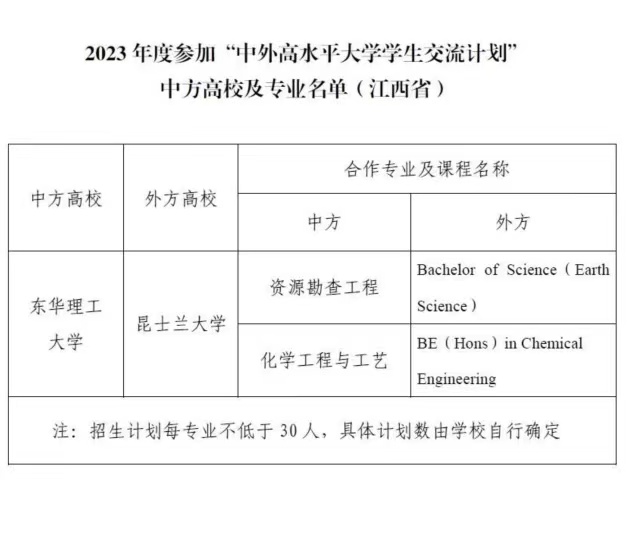 近日,教育部中外人文交流中心下发了《关于同意雷速网页版、景德镇陶瓷大学参加“中外高水平大学学生交流计划”的通知》(人文中心函[2023]54号),确定雷速网页版成为2023年度“中外高水平大学学生交流计划”项目高校,同意雷速网页版与澳大利亚昆士兰大学合作,就“资源勘查工程”、“化学工程与工艺”两个本科专业开展联合培养,并于2023年9月正式招生。