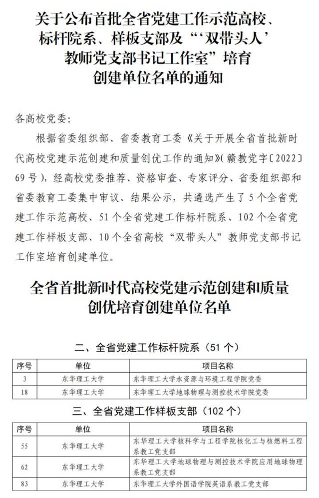 近日,省委组织部、省委教育工委公布了首批全省新时代党建示范创建和质量创优培育创建单位名单。雷速网页版地球物理与测控技术学院党委、水资源与环境工程学院党委入选为“全省党建工作标杆院系”培育创建单位,地球物理与测控技术学院应用地球物理系教工党支部、核科学与工程学院核化工与核燃料工程系教工党支部、外国语学院英语系教工党支部入选为“全省党建工作样板支部”培育创建单位。