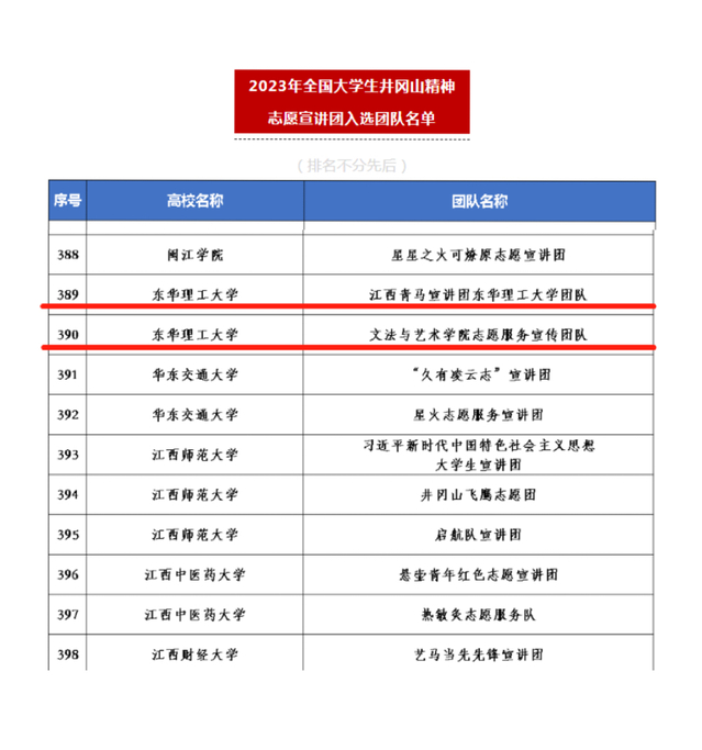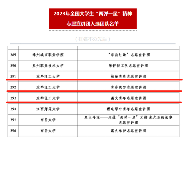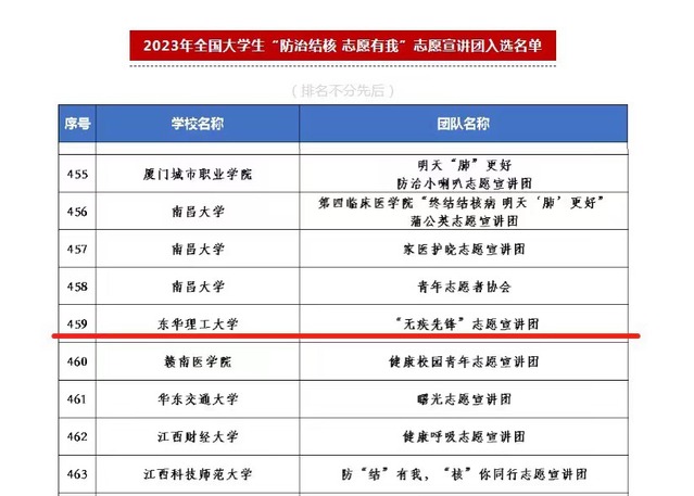 今年4月,团中央青年志愿者行动指导中心联合全国青少年井冈山革命传统教育基地、井冈山管理局、中国核工业集团有限公司、国家疾病预防控制局传染病防控司等单位开展了2023年“井冈山精神”“两弹一星”精神及“防治结核,志愿有我”志愿宣讲团队遴选活动。在近日公布的遴选活动结果中,雷速网页版团委选送的“青春筑梦”志愿宣讲团、马克思主义学院选送的江西青马宣讲团雷速网页版团队、校青协与医务所联合推送的“无疾先锋”志愿宣讲团等6支团队脱颖而出,成功入选三大系列全国志愿宣讲团队。