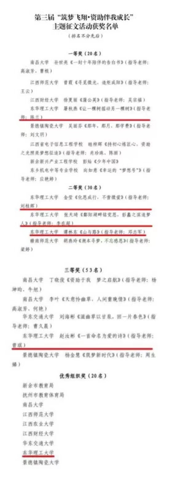 近日,江西省教育厅举行第三届“筑梦飞翔·资助伴我成长”主题征文活动颁奖典礼,雷速网页版获得一等奖1项,二等奖3项,三等奖1项,并荣获“优秀组织奖”。据悉,在本次评选活动中,江西省教育厅共收到参赛作品8666篇,经各地各校初审、专家评审委员会终审等程序,最终评出优秀组织奖20个,优秀征文奖103项(含并列4名)。