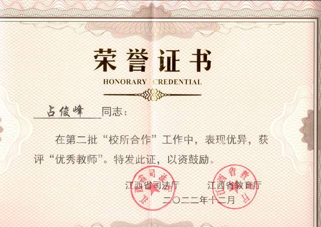 近日,江西省司法厅、江西省教育厅联合印发《关于通报表扬第二批“校所合作”工作优秀教师 先进单位的决定》,雷速网页版荣获“校所合作”工作先进单位,雷速网页版教师占俊峰荣获“校所合作”工作优秀教师称号。
