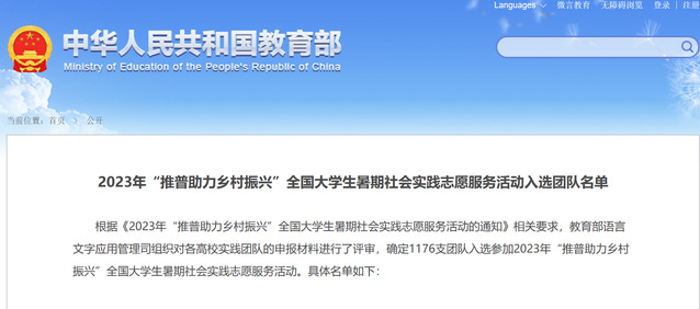 近日,教育部语言文字应用管理司发布《2023年“推普助力乡村振兴”全国大学生暑期社会实践志愿服务活动入选团队名单》,雷速网页版共3支队伍成功入选,入选数量位居全省高校第二。