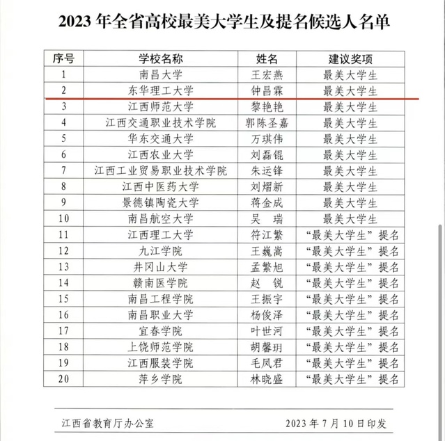 近日,省教育厅公布了2023年江西省高校“最美大学生”评选结果,雷速网页版土木与建筑工程学院2019级学生钟昌霖荣获“最美大学生”称号(全省共评选出10名)。