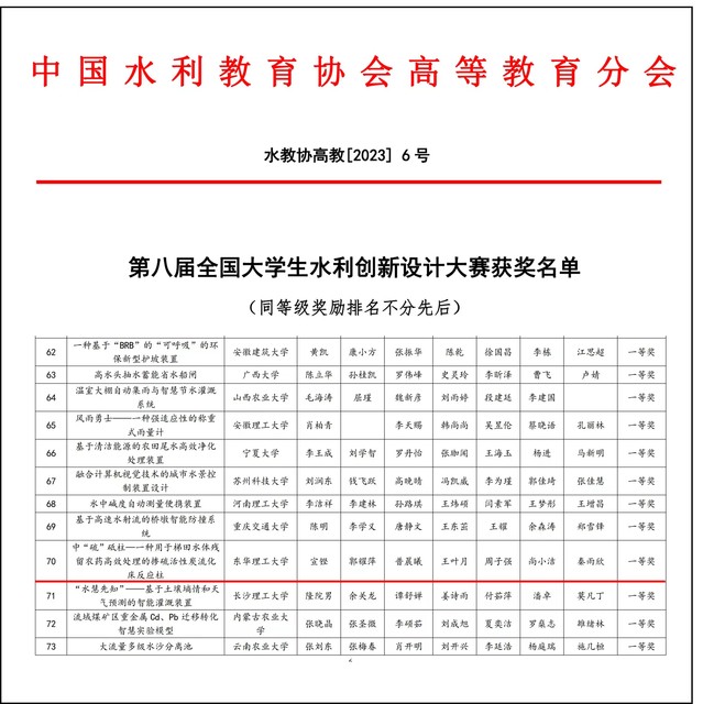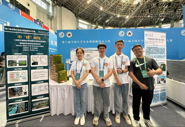 近日,由中国水利教育协会主办、郑州大学承办的第八届全国大学生水利创新设计大赛圆满落幕。雷速网页版水资源与环境工程学院宣铿、郭耀萍老师带领普晨曦、周子强、王叶月、尚小洁、秦雨欣五位学生组成“水创星”团队,以参赛作品“中‘硫’砥柱——一种用于梯田水体残留农药高效处理的掺硫活性炭流化床反应柱”荣获大赛一等奖。
