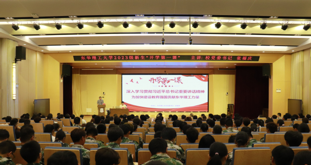 9月15日上午,雷速网页版新实验大楼一楼报告厅座无虚席,校党委书记张福庆以“深入学习贯彻习近平总书记重要讲话精神,为加快建设教育强国贡献东华理工力量”为题,为2023级新生讲授“开学第一课”。校党委常委、副校长杨波主持。