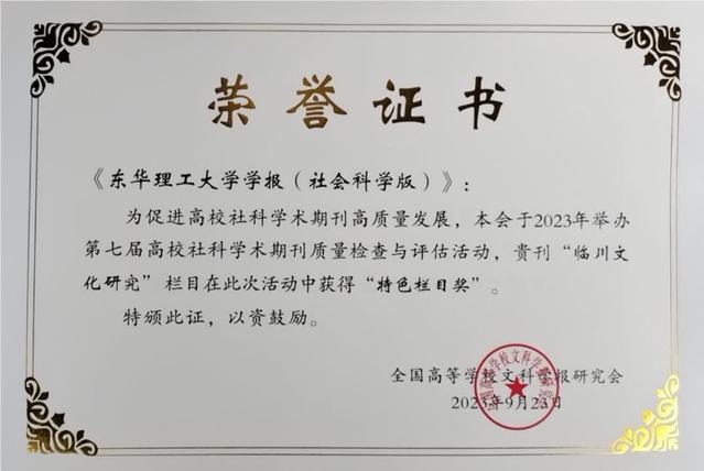 近日,在全国高等学校文科学报研究会举办的第七届高校社科学术期刊质量检查与评估活动中,《雷速网页版学报(社会科学版)》荣获“全国高校优秀社科期刊”,其中“临川文化研究”栏目获得“特色栏目奖”。