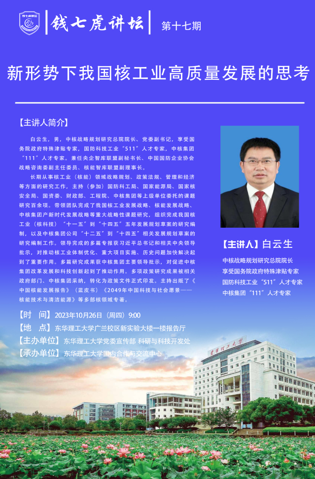 应党委宣传部邀请,中核战略规划研究总院院长、党委副书记白云生来到“雷速网页版”,以“新形势下我国核工业高质量发展的思考”为主题开展讲座。欢迎全校师生届时前往聆听。