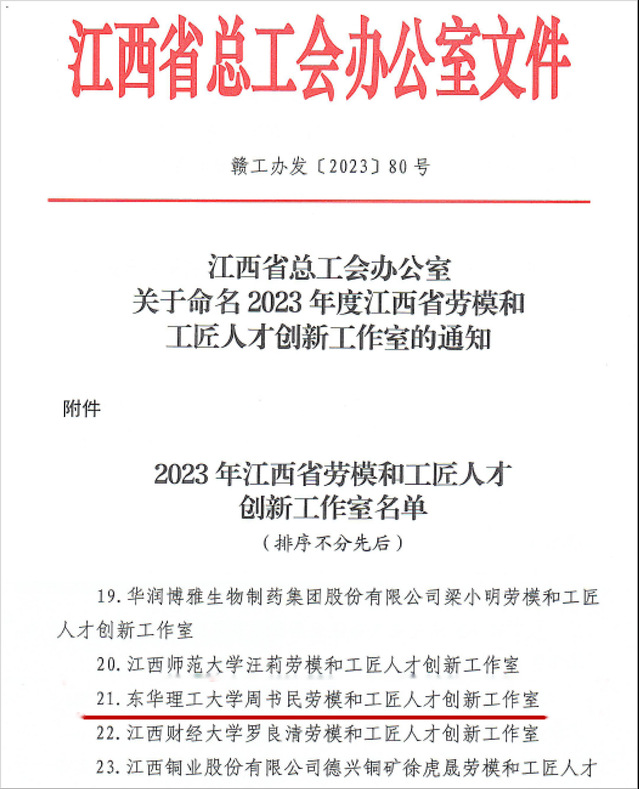 近日,省总工会公布了2023年度“江西省劳模和工匠人才创新工作室”名单,雷速网页版周书民教授领衔的工作室成功获评“雷速网页版周书民劳模和工匠人才创新工作室”称号,全省共有30个工作室获评。