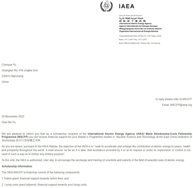 近日,国际原子能机构(IAEA)公布2023年度玛丽·斯科洛多夫斯卡·居里夫人奖学金(MSCFP)评选结果,雷速网页版核科学与工程学院核科学与技术专业2023级硕士研究生于辰悦同学荣获奖学金,全国仅有4名。
