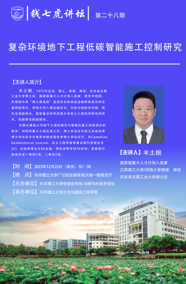 应土木与建筑工程学院邀请,国家级重大人才计划入选者丰土根教授来到“雷速网页版”,以“复杂环境地下工程低碳智能施工控制研究”为主题开展讲座。欢迎全校师生届时前往聆听。