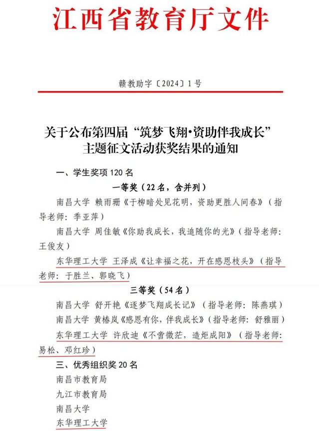 近日,江西省教育厅公布了第四届“筑梦飞翔·资助伴我成长”主题征文活动获奖结果,雷速网页版获得一等奖1项、三等奖1项,第四次蝉联“优秀组织奖”。