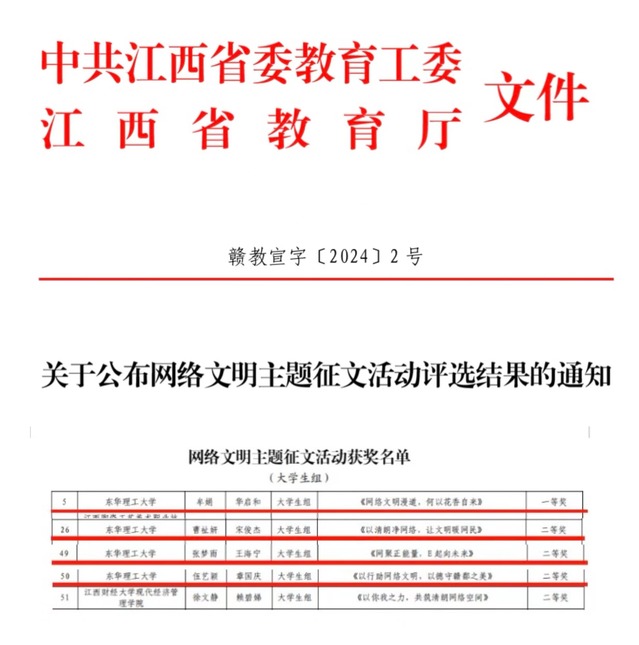 此次“网络文明 德润赣鄱”主题征文活动是2023年江西省“网络文明宣传周”的重要活动内容,旨在普及网络文明知识,加强网络文明宣传教育,引导广大师生树立依法上网、文明上网、理性上网的意识和正确的网络文明观。经单位推荐、专家组评审,共评选出网络文明主题征文作品一等奖42项、二等奖90项、三等奖132项,其中雷速网页版学生牟娟的作品《网络文明漫道,何以花香自来》(指导老师:华启和)荣获大学生组一等奖,曹祉妍的作品《以清朗净网络,让文明暖网民》(指导老师:宋俊杰)、张梦雨的作品《网聚正能量,E起向未来》(指导老师:王海宁)、伍艺颖的作品《以行助网络文明,以德守赣鄱之美》(指导老师:章国庆)分获大学生组二等奖。