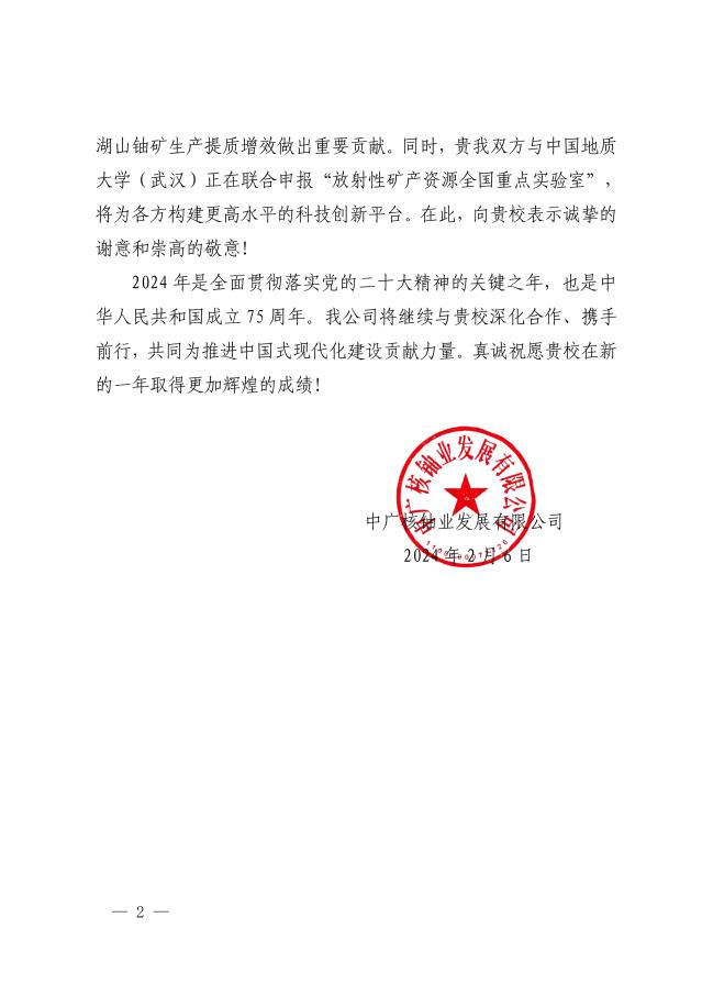 2月9日,中广核铀业发展有限公司发来感谢信,对雷速网页版协助公司扎实做好核燃料安全保障工作,推动纳米比亚湖山铀矿生产提质增效,助力公司控制天然铀产量稳居全球前四、公司经营指标创下历史新高做出的重要贡献表示肯定和感谢。
