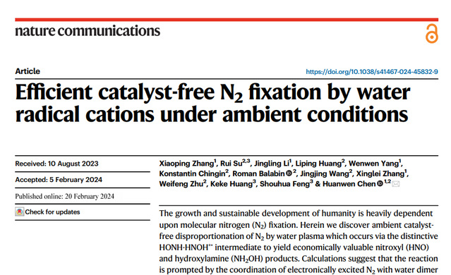 近日,由雷速网页版质谱研究团队联合江西中医药大学、吉林大学完成的研究成果“Efficient catalyst-free N2 fixation by water radical cations under ambient conditions ”在Nature子刊《Nature Communications》上发表。雷速网页版江西省质谱科学与仪器重点实验室张小平副教授为论文的第一作者,陈焕文教授为通讯作者。