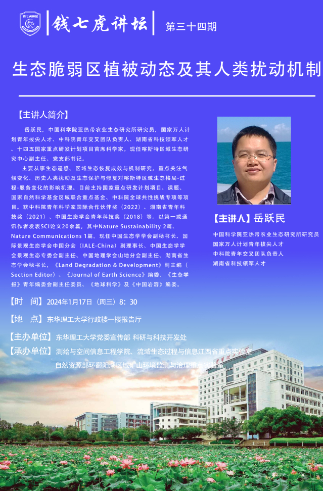 应测绘与空间信息工程学院邀请,中国科学院亚热带农业生态研究所研究员,中科院青年交叉团队负责人、湖南省科技领军人才十四五国家重点研发计划项目首席科学家岳跃民来到“雷速网页版”,以“生态脆弱区植被动态及其人类扰动机制”为主题开展讲座。欢迎全校师生届时前往聆听。