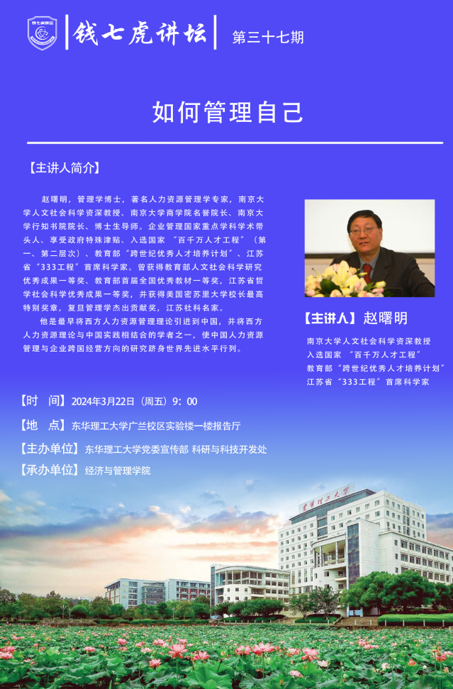 应经济与管理学院邀请,南京大学人文社会科学资深教授,国家“百千万人才工程”,教育部“跨世纪优秀人才培养计划,江苏省“333工程”首席科学家赵曙明来到“雷速网页版”,以“如何管理自己”为主题开展讲座。欢迎全校师生届时前往聆听。