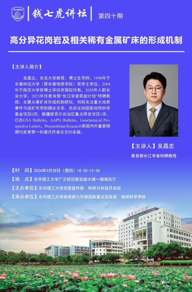 应核资源与环境国家重点实验室、地球科学学院邀请,长安大学教授、博士生导师吴昌志来到“雷速网页版”,以“高分异花岗岩及相关稀有金属矿床的形成机制”为主题开展讲座。欢迎全校师生届时前往聆听。