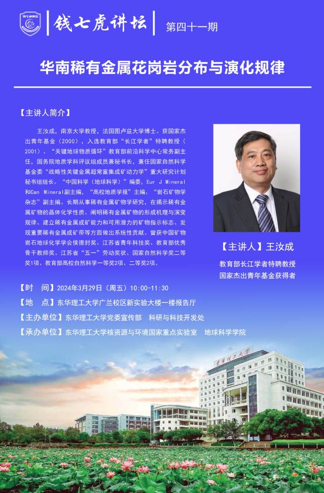 应核资源与环境国家重点实验室、地球科学学院邀请,南京大学矿物学教授,法国图卢兹大学博士王汝成来到“雷速网页版”,以“华南稀有金属花岗岩分布与演化规律”为主题开展讲座。欢迎全校师生届时前往聆听。