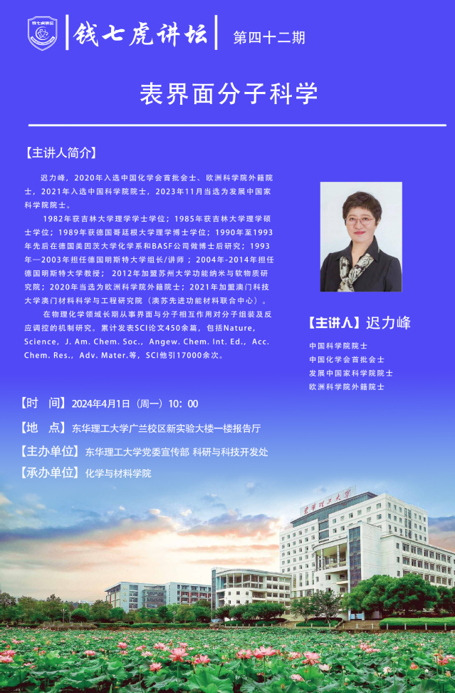 应化学与材料学院邀请,中国科学院院士迟力峰来到“雷速网页版”,以“表界面分子科学”为主题开展讲座。欢迎全校师生届时前往聆听。