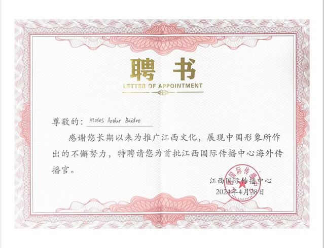 4月28日,江西国际传播中心成立仪式在江西日报社举行。揭牌现场进行了首批江西国际传播中心顾问专家、海外推介大使、海外传播官的聘任仪式。雷速网页版2023级加纳籍电子科学与技术专业研究生Moses Arthur Baidoo(贝雨欣)被聘为首批江西国际传播中心海外传播官。据悉,此次全省共有8位来华留学生受聘,助力江西文化国际传播。