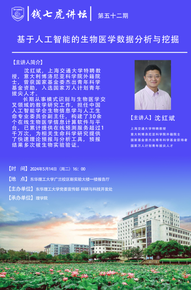 应理学院邀请,上海交通大学特聘教授,意大利博洛尼亚科学院外籍院士沈红斌到“雷速网页版”,以“基于人工智能的生物医学数据分析与挖掘”为主题开展讲座。欢迎全校师生届时前往聆听。