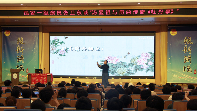 讲座伊始,张卫东介绍了汤显祖的生平及他的“临川四梦”作品——《紫钗记》《还魂记》《南柯记》《邯郸记》,向师生们讲述昆曲的相关知识,介绍了昆曲的分类与特点。