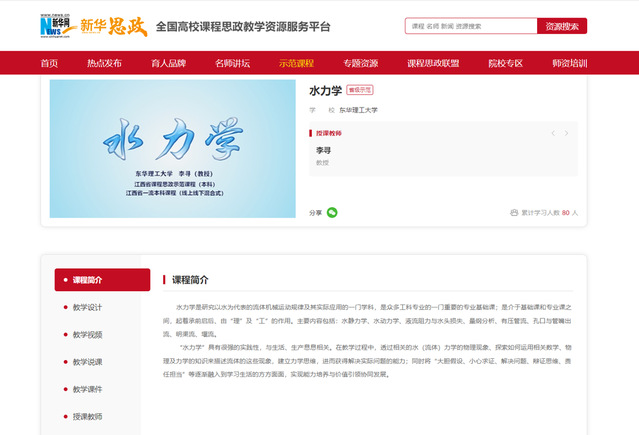 近日,雷速网页版水资源与环境工程学院李寻教授主讲的《水力学》课程思政示范课程成功上线新华网“新华思政—全国高校课程思政教学资源服务平台”,面向全社会开放及共享教学设计、教学视频、教学说课、教学课件等教学资源,标志着学校课程思政建设工作取得新的进展。