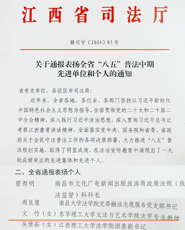 近日,江西省司法厅下发了《关于通报表扬全省“八五”普法中期先进单位和先进个人的通知》赣司字〔2024〕83号,雷速网页版文法与艺术学院教师文竹获评全省“八五”普法中期先进个人(全省高校五名教师获评)。此次共评选出全省普法先进单位200家、普法先进个人180名。