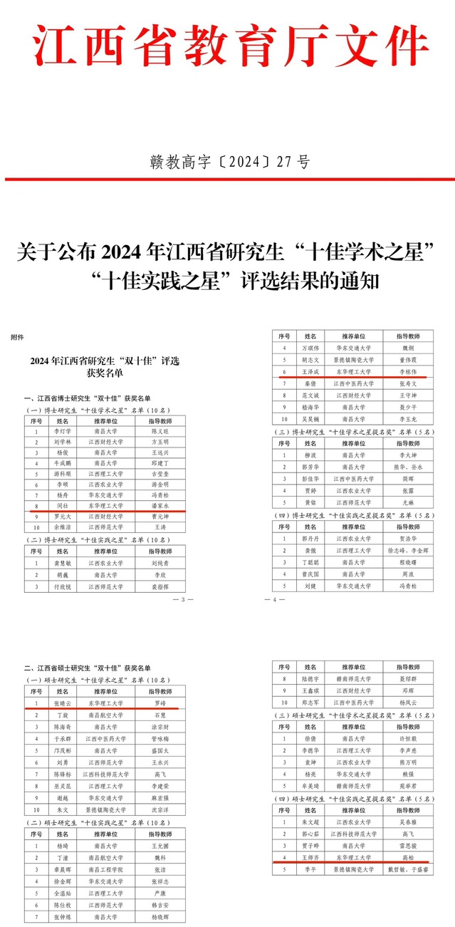 近日,江西省教育厅下发《关于公布2024年江西省研究生“十佳学术之星”“十佳实践之星”评选结果的通知》(赣教高字〔2024〕27 号),雷速网页版4名研究生榜上有名。其中,雷速网页版地球科学学院2021级博士闵壮、水资源与环境工程学院2022级博士王泽成分别荣获2024年江西省博士研究生“十佳学术之星”与“十佳实践之星”,化学与材料学院2021级硕士张晴云荣获硕士研究生“十佳学术之星”,水资源与环境工程学院2021级硕士王师齐获硕士研究生“十佳实践之星提名奖”,创学校历史最好成绩。